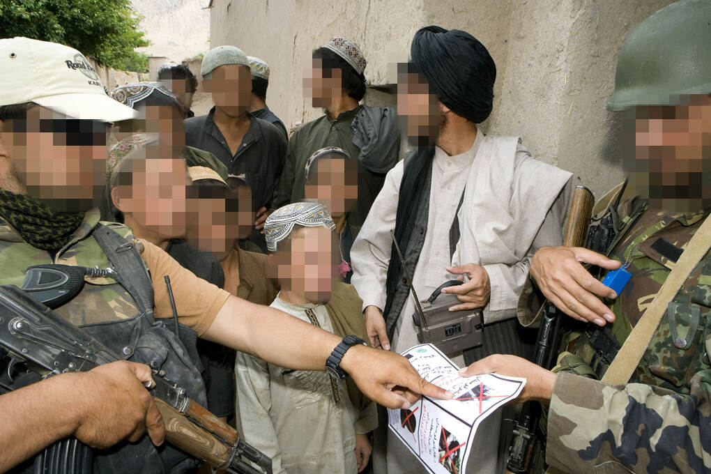 In het Afghaanse dorpje Karbala worden in 2007 pamfletten uitgedeeld waarop uitgeschakelde Talibanleiders te zien zijn.
