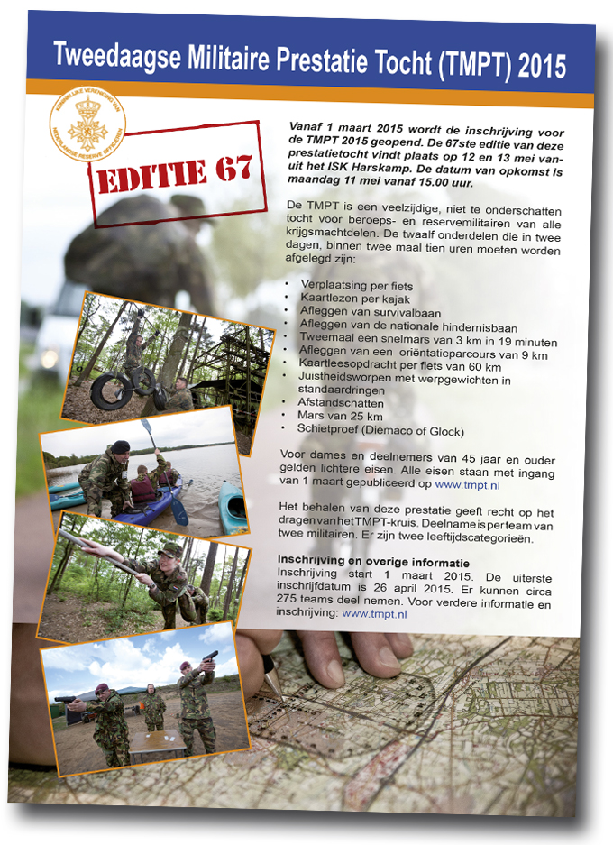 Voor dames en deelnemers van 45 jaar en ouder gelden lichtere eisen. Het behalen van deze prestatie geeft recht op het TMPT-kruis. Deelname is per team van 2 militairen. De uiterste inschrijfdatum is 26 april. Er kunnen circa 275 teams meedoen. Voor meer informatie en inschrijving: www.tmpt.nl.