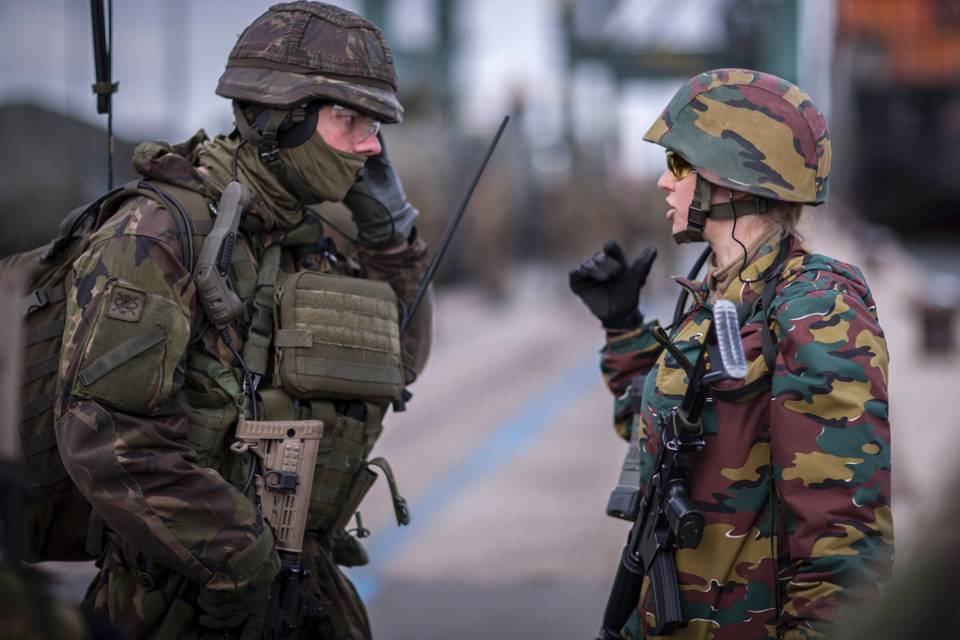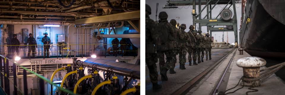 De loopbrug hangt nog maar net op de kade als het ontvangstcomité aan komt rijden. Tientallen militaire voertuigen stellen zich op voor het schip, waarna gewapende Nederlandse en Belgische genisten uitstappen.