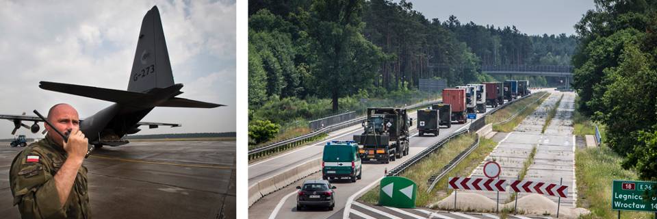 Links: Op het vliegveld werken Nederlandse militairen nauw samen met de Polen om mensen en middelen zo snel mogelijk in het oefengebied te krijgen. Rechts: De road move van 11 Luchtmobiele Brigade onderweg naar oefengebied Zagan. Foto: SM Maartje Roos