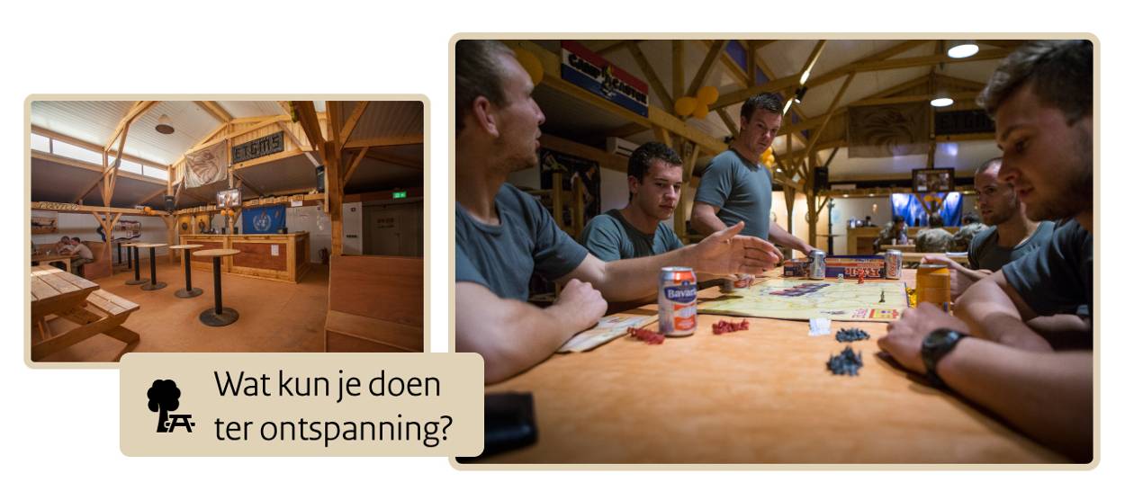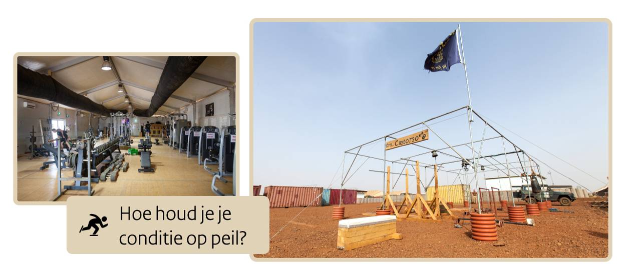 Je kunt een rondje gaan hardlopen op het kamp. Dat is ongeveer 1.600 meter. Doe dit bij voorkeur voor 06.00 uur, de temperatuur loopt overdag al snel op. Je kunt ook terecht in de net geopende sportzaal. In de koele ruimte ligt 24 uur per dag moderne fitnessapparatuur te wachten. Ook is er een sportinstructeur aanwezig. Er worden volop sportactiviteiten georganiseerd zoals boksen, volleybaltoernooien en voetbalwedstrijden.
