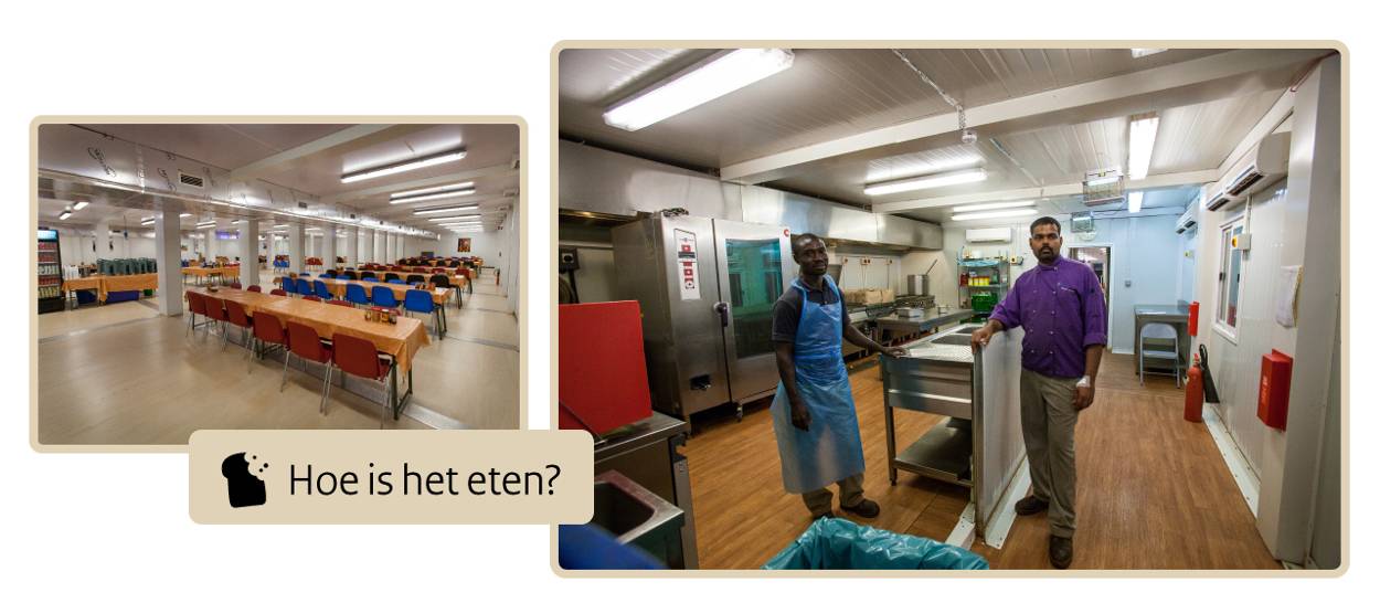 Het eten wordt verzorgd door civiele cateraar Supreme. In een moderne keuken bereidt het, veelal lokaal, personeel 3 keer per dag een goede maaltijd. Deze kan worden genuttigd in de nieuwe, gekoelde eetzaal.
