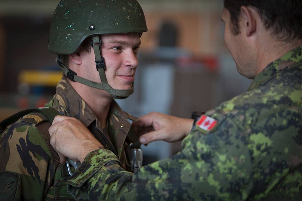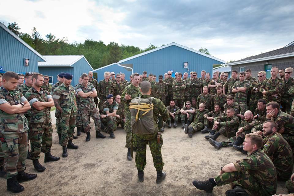 Militairen van de para-compagnie van 13 Infanteriebataljon en collega’s van het Korps Mariniers hebben zich op Cold Lake Canada Airbase verzameld rondom 2 instructeurs van 3rd Battalion Princess Patricia’s Canadian Light Infantry (3PPCLI). Zij reiken de Nederlanders tips en tools aan voor het parachutespringen met Canadees materieel.