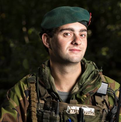 “Als Jurgen en ik in actie komen, moeten we een paar minuten enorm multitasken. Gelijk handelen, niet te lang nadenken. Zodra we van de grondcommandant de opdracht ‘luchtsteun aanvragen’ krijgen, wordt het hectisch. Vaak liggen onze troepen onder vuur, waardoor ze niet kunnen manoeuvreren. Kort geef ik de vlieger een situatieschets: waar bevinden onze eigen troepen zich, waar is de vijand en welk doel willen we vernietigen. Soms krijgen we steun van meerdere toestellen, die we allemaal naar een ander doel begeleiden. Daarbij bepaal ik wie waar vliegt en op welke hoogte. Ze moeten namelijk wel buiten het bereik van luchtafweergeschut blijven. Ondertussen maak ik met Jurgen in rap tempo een plan van aanpak. Gebruiken we een laserstraal om het doel aan te wijzen of geven we alleen coördinaten door? Het meten van coördinaten is vrij snel gedaan, maar met laseren moet Jurgen z’n kop letterlijk een poosje boven het maaiveld uitsteken. Dat is niet altijd zonder risico. Regelmatig zitten we vlakbij de gevarenzone, maar net op veilige afstand van de bom. Via de radio sturen op zicht is overigens ook een optie. Een goede samenwerking tussen mij en de Laser Operator is erg belangrijk, daarom vormen Jurgen en ik een vast koppel. We hebben vaak aan één woord genoeg. Ik ben eindverantwoordelijk, maar hij denkt altijd met me mee en houdt mij een spiegel voor. We klaren de klus echt samen. Dat is zo gaaf.”