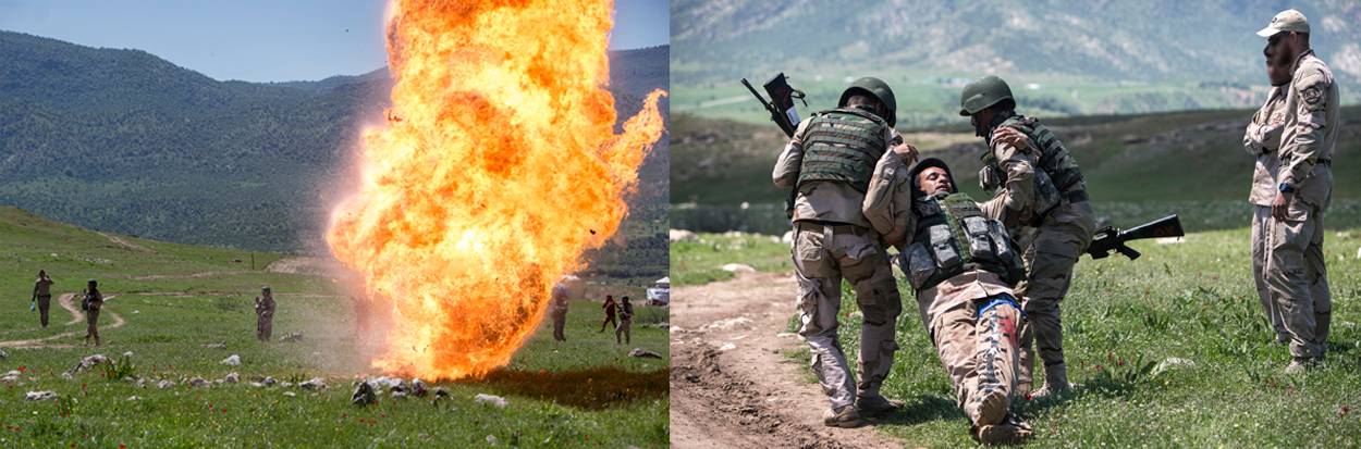 Zijn pelotonscommandant onderstreept dit. Hij staat 200 meter verderop, met zijn vingers in de oren. Verstandig, want eerste luitenant Johan kent het scenario, weet dat er een gigantische knal aan komt. Er klapt een improvised explosive device (beter bekend als IED). De intense hitte die vrijkomt, doet militairen achteruit deinzen. Peshmerga’s schreeuwen. Twee strijders sleuren een 'zwaargewonde' collega naar achteren, waarna geneeskundige hulp wordt toegepast. Hij leeft in ieder geval nog, en kan per helikopter naar het ziekenhuis worden vervoerd.