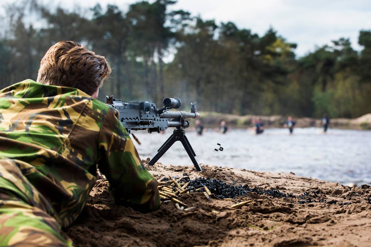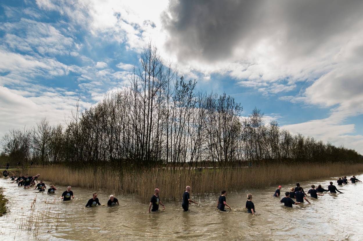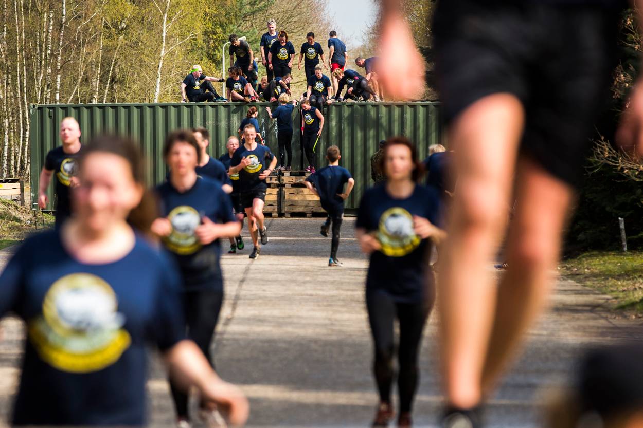 Bij de start doet elke groep een warming-up om goed voorbereid aan de sportieve uitdaging te beginnen. Op harde beats springen de deelnemers op en neer, doen ze push-ups en squats. “Lekker diep gaan! Keurig!”, roept de sportinstructrice bemoedigend. Om de paar minuten gaat een nieuwe afdeling over de startlijn. Sporters ploegen door het mulle zand, lopen over asfalt, rennen door het bos en snellen over de heide. Ook waden ze door sloten, terwijl er om hen heen wordt ‘geschoten’. Een van de deelnemers gooit voor de grap haar handen in de lucht: “Ik geef me over!”.