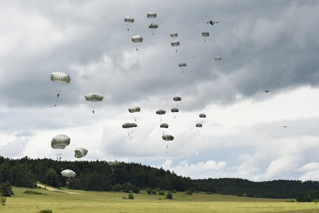 Binnen enkele seconden hangt de lucht boven dropzone Bunker vol ‘bolletjes’. Wind staat er nauwelijks boven de Duitse oefenplaats Grafenwöhr en de afdaling gaat rap. Onder elke parachute bungelt een militair met 50 kilo bepakking. Om de landing te verzachten houden de para’s hun benen bij elkaar, het lichaam lichtgekromd, de spieren aangespannen….zodra hun voeten de grond raken maken ze een zogeheten pararol om te voorkomen dat botten breken.