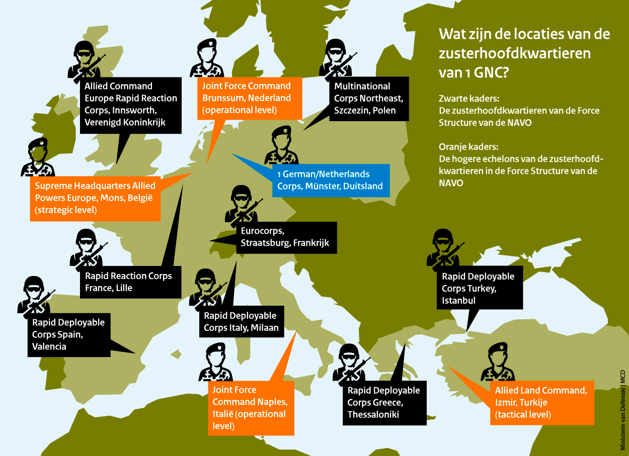 Deze nieuwe NAVO-taak voor hoofdkwartieren bestaat pas 1,5 jaar. Op dit moment staan de NATO Rapid Deployable Corps' van Italië (Milaan) en Turkije (Istanbul) stand-by. 1GNC heeft geregeld contact met de beide hoofdkwartieren voor handige tips, maar het korps heeft ook eigen inzichten. “We nemen niet alles over, hoor. Want we zijn ook wel een beetje eigenwijs natuurlijk”, lacht de luitenant-generaal.