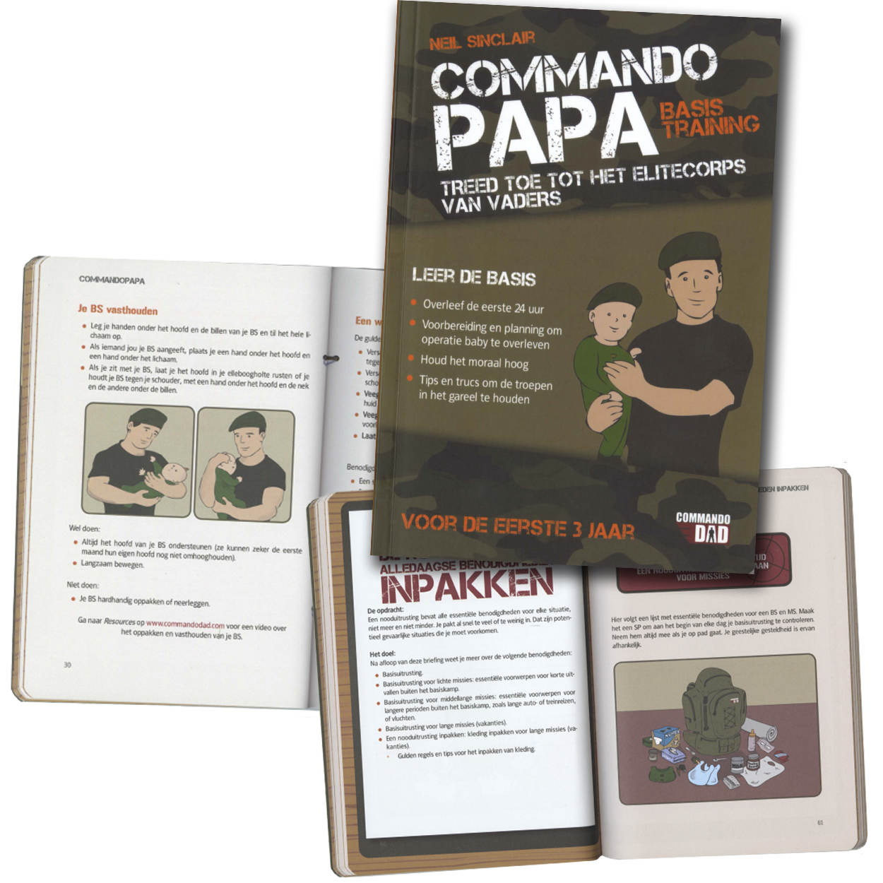 Niemand kan zich helemaal voorbereiden op het vaderschap. Toch waagt ex-commando en vader van 3 Neil Sinclair een ludieke poging in het boek Commando Papa. Op geestige wijze stoomt hij kersverse vaders klaar voor de opvoeding van hun nieuwe BS (babysoldaat). De no-nonsense handleiding voor het vaderschap is verpakt in militaire termen. Zo verwijst het ‘basiskamp’ naar thuis, de ‘eenheid’ naar het gezin en met ‘bomopruiming’ bedoelt Sinclair vieze luiers opruimen. De Brit is zelf huisvader, volgens hem een van de zwaarste taken ooit. Hij schreef dit makkelijk leesbare boek met korte teksten en vele actiepunten om ongetrainde papa’s de eerste 3 jaar met raad en daad bij te staan. In het hoofdstuk ‘Nieuwe Rekruten: de eerste 24 uur overleven’ geeft hij bijvoorbeeld advies over hoe vaders hun BS een boertje kunnen laten doen. Met deze Basic Battle Skills moet het ouderschap wel een succes worden! Het ISBN-nummer is 9789045208053. Het werk is uitgegeven door Karakter Uitgevers  en kost €14,99.