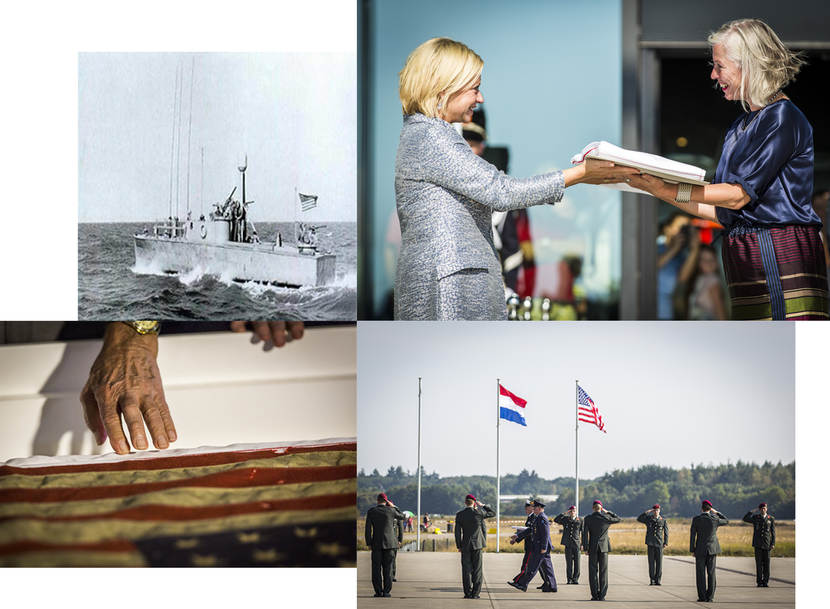 De vlag, eerder dit jaar op een veiling gekocht door oud-ondernemer en (kunst)verzamelaar Bert Kreuk, arriveerde per Chinook. 2 militairen droegen het reliek door een erehaag van Amerikaanse en Nederlandse militairen naar minister Hennis-Plasschaert. “Deze vlag moet ons eraan herinneren dat vrijheid nooit vanzelfsprekend is. Samen moeten we ons uiterste best doen om de waarden hoog te houden waarvoor de helden van D-Day bereid waren te sterven.”