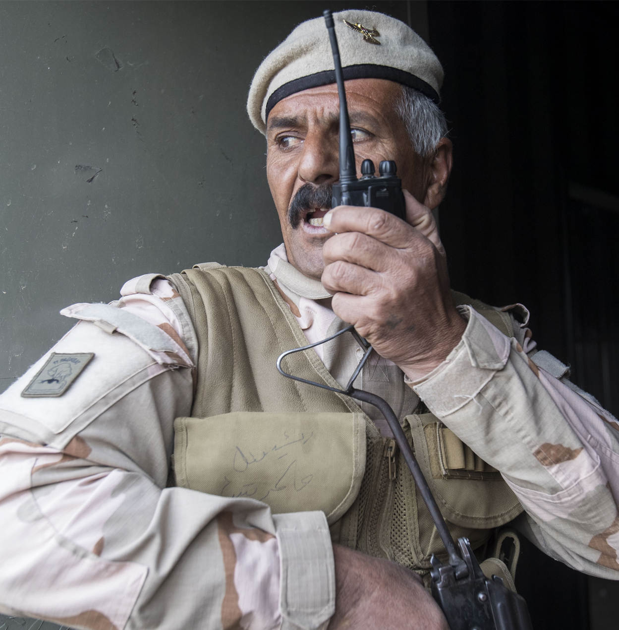 “Of ik bang ben om dood te gaan?” Khalid Muhammad Amin schiet in de lach. De gitzwarte snor op zijn bovenlip doet een dansje en de kraaienpootjes bij zijn ogen lachen mee. De frontlijn heeft weinig geheimen voor deze sergeant-majoor van de Peshmerga; al sinds 1992 vecht hij voor het roemruchte Koerdische strijdersgilde.