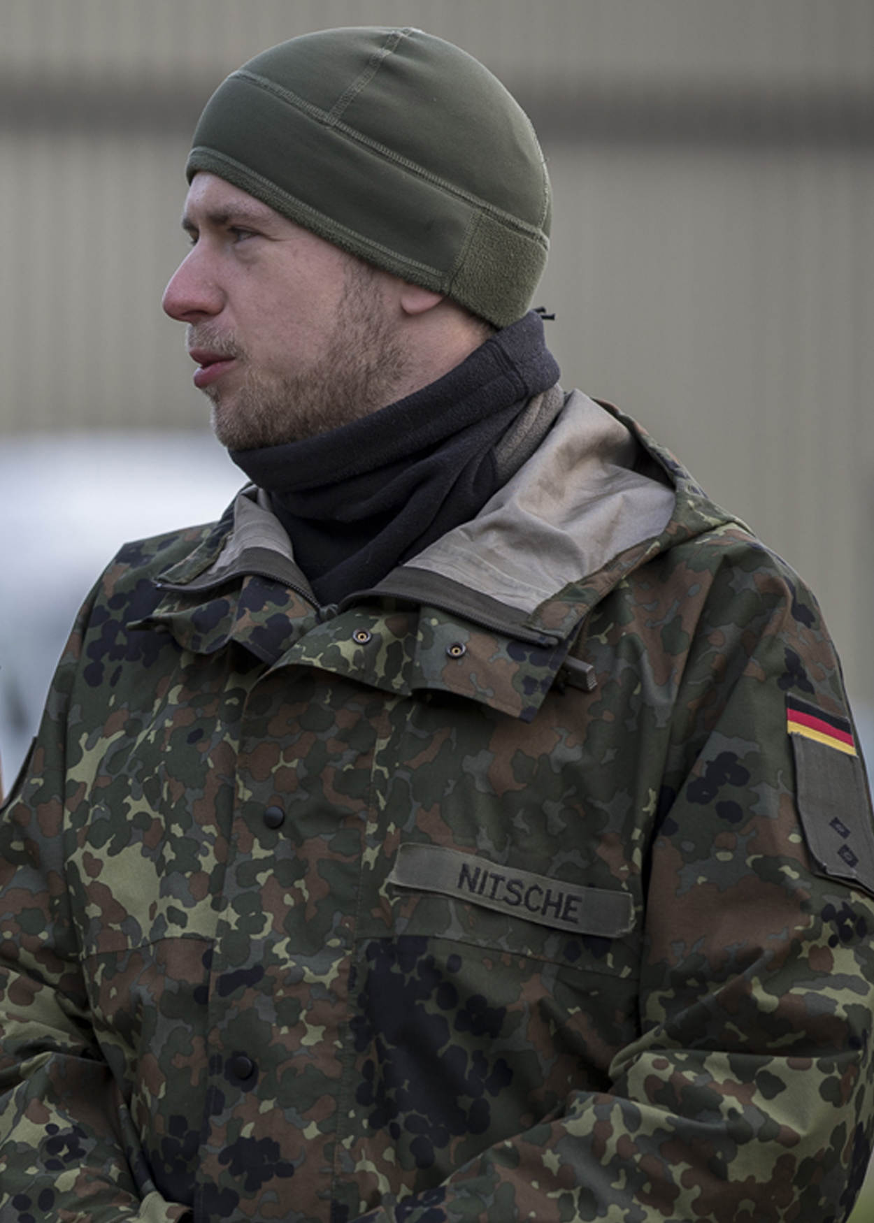 “We voelen ons zeer welkom. We zien hier hoe de Nederlandse CBRN-specialisten te werk gaan en leren zo bij. Erg interessant. Onze aanpak komt grotendeels overeen met die van de Nederlanders, al zijn er ook verschillen. Zo hebben wij een mobiele hijskraan voor het schoonspuiten van voertuigen, terwijl Nederlanders steigers neerzetten. We communiceren met onze Nederlandse collega’s in een mix van Duits en Engels. Het is soms even zoeken naar woorden, maar we komen er altijd uit.”