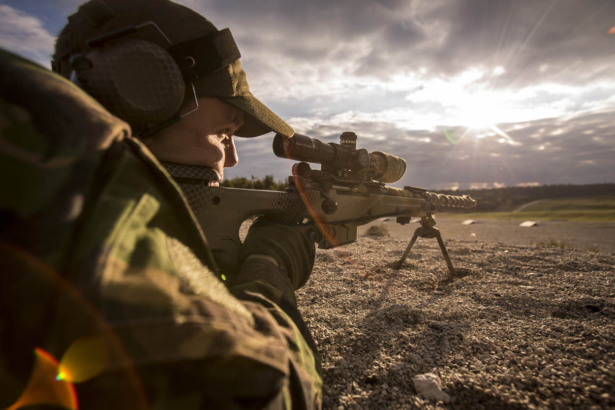 ^  Bij de headerfoto: Een fuselier van de Bravo-compagnie van 17 Pantserinfanteriebataljon legt aan voor het perfecte schot tijdens de 2016 European Best Sniper Squad Competition in het Duitse Grafenwöhr.