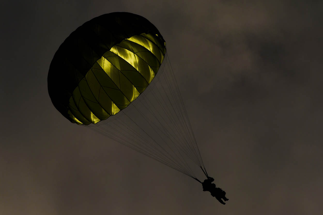 ^  Tijdens oefening Swift Response zweeft een rode baret van 11 Infanteriebataljon boven dropzone ‘Bunker’ in de Duitse oefenplaats Grafenwöhr.