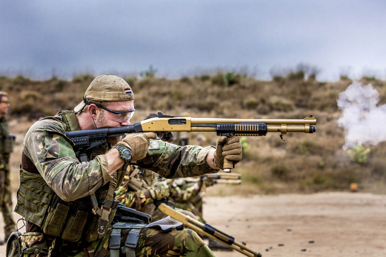 ^  In het CD&E-traject Ranger neemt een militair van 12 Infanteriebataljon een doel te grazen met een shotgun.