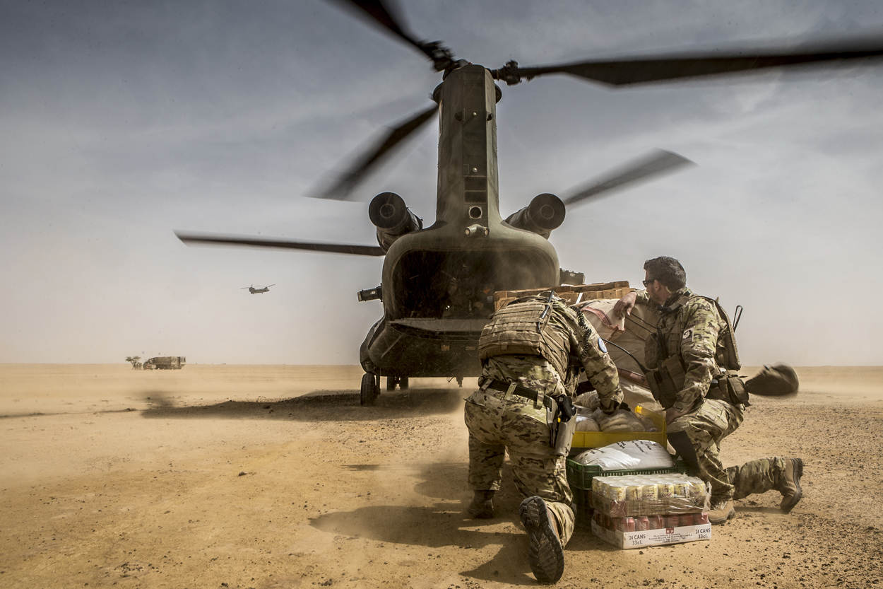 ^  Leden van de Special Operations Land Task Group worden in Mali halverwege een operatie bevoorraad door een Chinook-transporthelikopter van de luchtmacht.