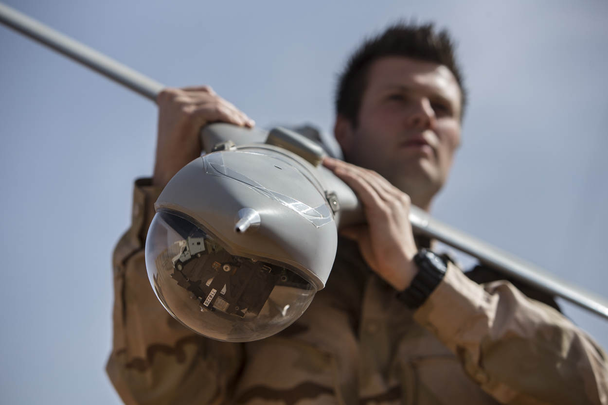 ^  Nadat de ScanEagle ongezien en ongehoord een missie boven Mali heeft uitgevoerd, brengt een militair van het JISTARC de ‘elektronische adelaar’ weer naar het nest.