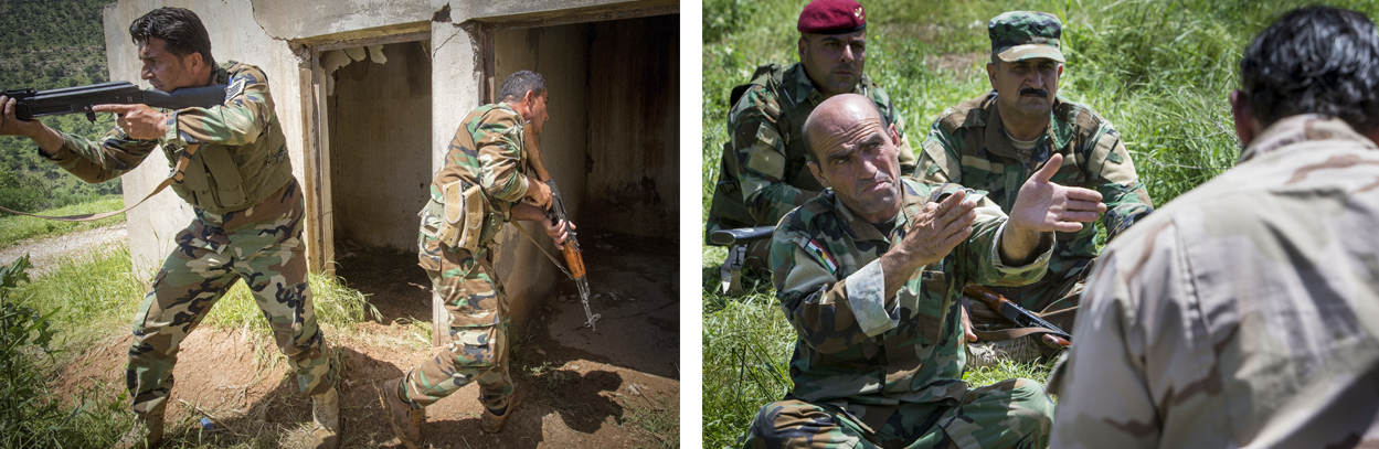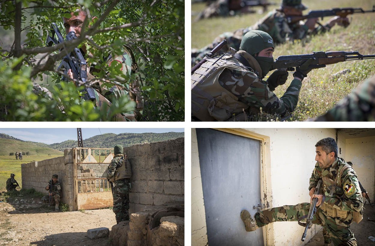 Atrush, 24 uur terug in de tijd. De laatste restjes zoete thee zijn weggegooid, vuurtjes uitgetrapt. Tijd voor een compagniesactie. Verkenners sluipen stilletjes door de bosjes richting het oefendorp waarvan de Nederlandse instructeurs hebben gezegd dat de vijand er zich ophoudt. Als de buitenste gebouwen zijn bereikt, sluiten meer Peshmerga’s aan. Gedecideerd springen de krijgers van huis naar huis, precies wetende welk pand ze moeten hebben. Bij de inbraak gaat het ineens snel. Twee vijanden worden onderkend, met luid geschreeuw ontwapend en bruusk weggevoerd. Een Peshmerga gooit rook om ongezien weg te kunnen komen. Tijdens de verplaatsing naar de voertuigen is er ‘vuur en beweging’. Einde oefening.