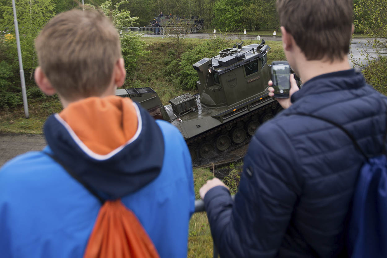 De 15-jarige Dennis is zo’n jongen die de kolonel maar wat graag enthousiast ziet worden. Met zijn vmbo-opleiding mobiliteit en autotechniek zou hij niet misstaan op de technische werkvloer van de landmacht. De jongen zelf zit nog in dubio. “Ik wilde een eigen autogarage, maar ik vind die grote dingen hier ook wel echt mooi man. In een garage ben je zo klaar met een auto, maar met zo’n tank (CV90 red.) ben je wel even wat langer bezig, denk ik. Dat lijkt me wel echt vet.”