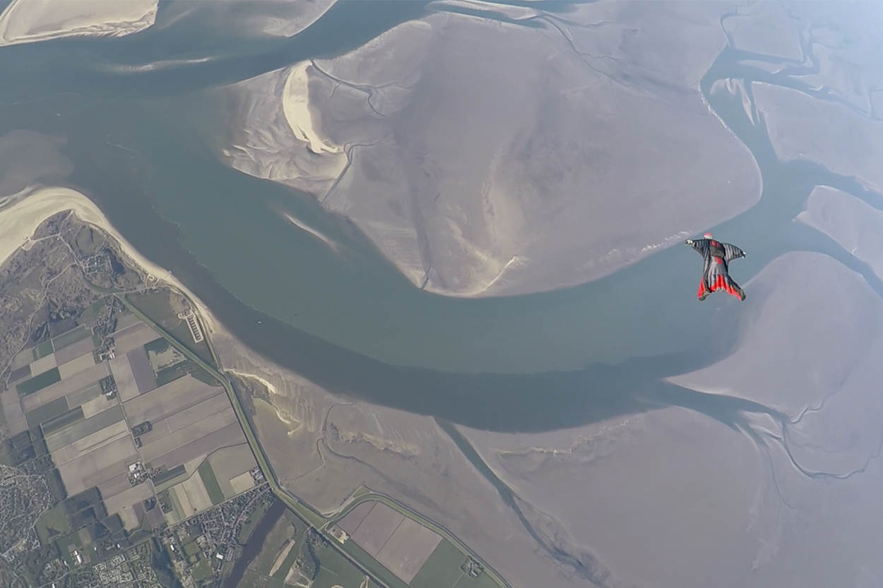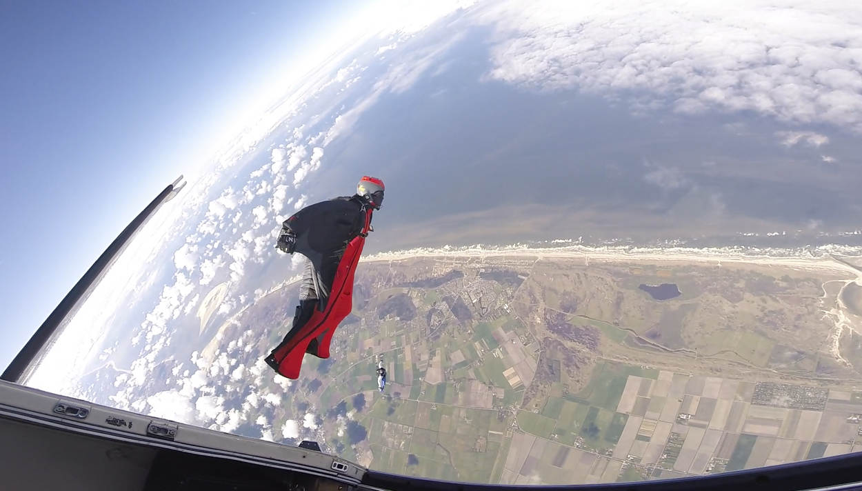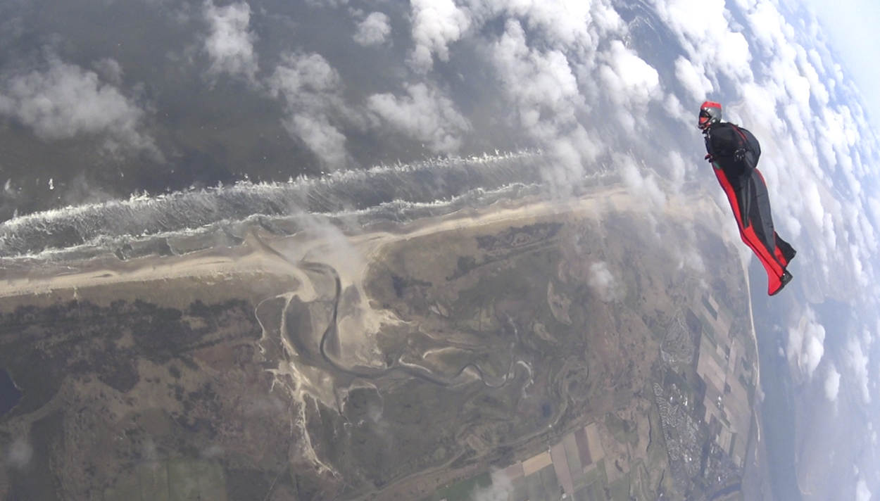 Een wingsuit is het best te omschrijven als een groot pak met vleugels onder de armen en tussen de benen, waardoor de springer trager naar beneden valt. Er is dus meer valtijd voordat de parachute open moet. “De neerwaartse snelheid wordt omgezet in voorwaartse snelheid”, vat Sebas samen. Een vrije val vanaf 10.000 voet duurt zo al snel ruim een minuut. Wie zonder wingsuit springt, moet vanaf die hoogte binnen 35 seconden zijn parachute al trekken. “Langer genieten dus.”