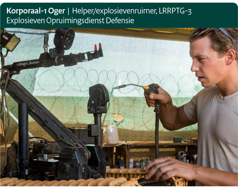“Ik ben hier als helper en explosievenruimer. Ik ben verantwoordelijk voor al het EOD-technisch materiaal en zorg dat mijn team zo snel en zo veilig mogelijk van A naar B komt. Een van mijn neventaken is namelijk chauffeur van de EOD-Bushmaster. We zijn hier met meerdere teams en gaan elke patrouille mee. Tijdens de lange- afstandsverkenningen zoekt de genie naar verdachte zaken. Als zij iets aantreffen, schakelen ze ons in. Wij hebben nog niets gevonden. Er waren enkele verdachte vondsten, maar dat zijn vaak lege lichtmortieren die zijn afgeschoten door eenheden uit andere landen. Geen IED’s is een goed teken. Eenheden uit andere landen, die in grote colonnes met civiele vrachtwagens over vaste routes rijden, worden wel aangegrepen. Zij pakken routes over brede wegen die voor de hand liggen en vormen zo een makkelijker doelwit. Wij zijn lastiger te peilen, dus moeilijker om te raken met een IED. Van te voren stippelen we een veilige route uit en kijken we waar kritieke punten liggen. Ook moeten we zorgen dat we niet vast komen te zitten, want dan ben je statisch en kun je een doelwit zijn. Dus ik houd rekening met alle voertuigen die achter me rijden, zoals vrachtwagens, MB’s en Fenneks. Dit is mijn eerste VN-missie. Hiervoor ben ik 3 keer in Afghanistan geweest. Dat waren hele andere missies; heftige uitzendingen in een hoger geweldsspectrum. Ook in Nederland ben ik drukker dan hier; thuis ben ik altijd bezig met bommen en explosieven ruimen.”