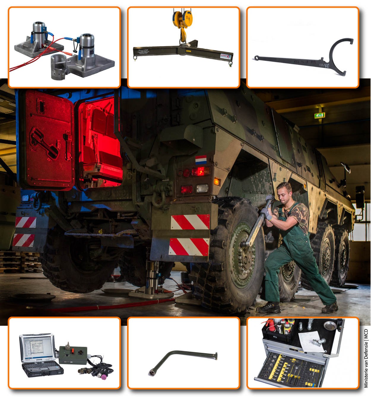 200 Boxer-pantserwielvoertuigen in 5 verschillende uitvoeringen krijgen jaarlijks een onderhoudsbeurt. Maar ook voor tussentijdse klussen staat korporaal-1 Alwin Goud klaar met een gereedschapskist waar menig klusjesman jaloers op is. Hij herstelt de voertuigen en gaat zo nodig het veld in om ter plaatse reparaties uit te voeren. Hieronder lichten we een aantal van zijn meest gebruikte tools toe: