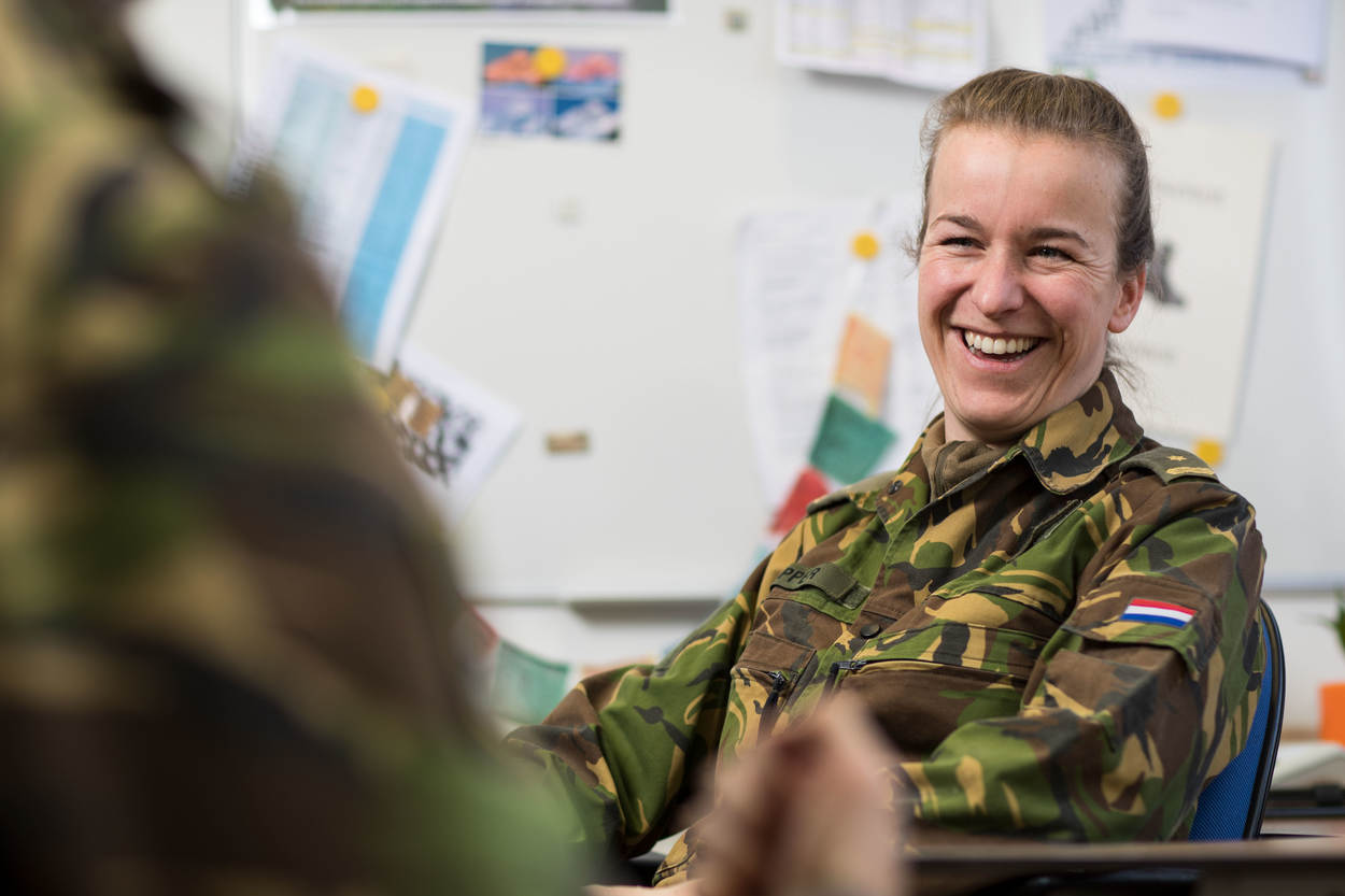 “Integendeel, mijn werk brengt me juist in situaties waarin ik er zelf steeds weer over na moet denken. Humanisme is voor mij: iedere keer opnieuw bij mezelf te rade gaan. Wat is belangrijk? Wat is van waarde? In vergelijking met andere levensbeschouwingen is het relatief nieuw. Militairen vragen me vaak wat ik nu eigenlijk doe en wat humanisme is. Dat is bijna altijd een aanleiding voor een mooie dialoog. Dat ik er zoveel over spreek, maakt het makkelijker om eraan vast te houden. En het staat natuurlijk letterlijk op mijn voorhoofd door de baret die ik draag.”