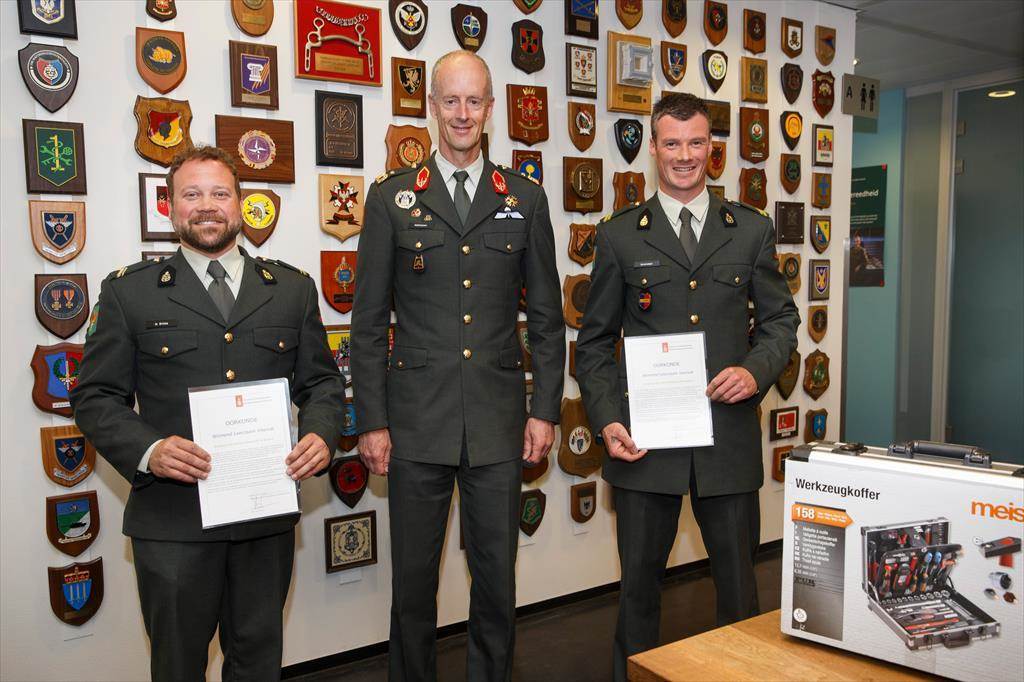 Monteurs sergeant-1 Ten Brinke en korporaal-1 Berendsen van de ODB-Groep van het B&TCo kregen medio mei een bijzonder bedankje. PC-LAS generaal-majoor Kees Matthijssen zette ze in het zonnetje, in het licht van ‘Leerzame Incidenten’ rondom bedrijfsveiligheid.