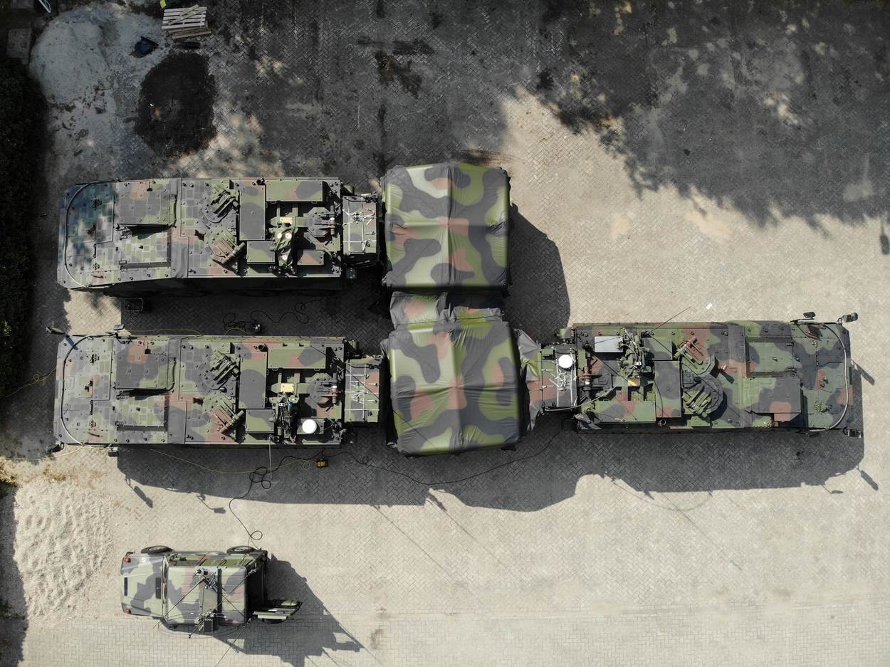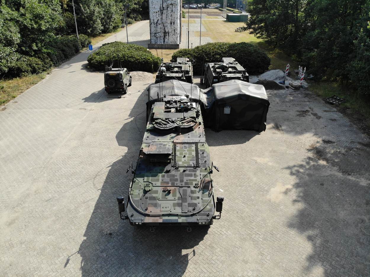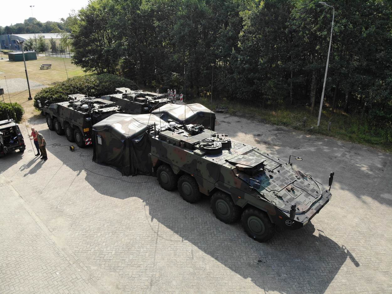 3 geschakelde Boxers in een proefopstelling van een Forward Command Post die de schakel tussen Main CP en bataljons moet worden. Een volledige FCP bestaat uit 5 voertuigen. De tentjes zijn optioneel. De witte Satcom schoteltjes moeten uiteindelijk groene antennes worden.
