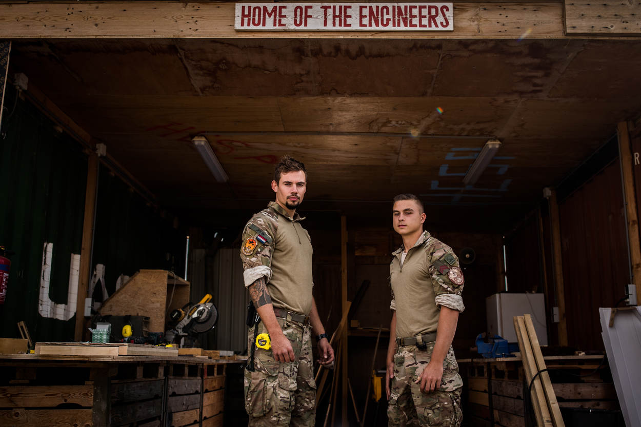 Ze zijn slechts met z’n tweeën, genisten Mike (21, rechts) en Jesse (25, links). Alle bouwwerkzaamheden in en rond het kamp nemen deze 2 soldaten op zich. Toen de CDS in november op bezoek was, kregen de soldaten uit zijn handen een CDS-coin. Dit eremetaal wordt slechts bij een bijzondere gelegenheid uitgereikt aan medewerkers die zich extra hebben ingezet. “Puur voor het harde werk”, vertelt soldaat-1 Mike. “Onze inzet is wel opgevallen.”