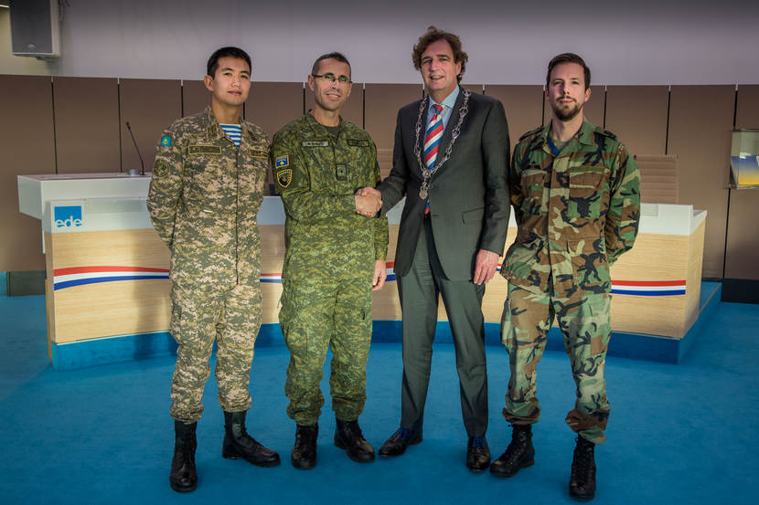 Een bijzondere gelegenheid: René Verhulst, burgemeester van Ede, ontving kapitein Azamat Ayaguzov uit Kazachstan, majoor Haliti Bekim uit Kosovo en kapitein Alex Verschure (NLD) om te spreken over de broze vrede tussen ‘Hollandia’ en Frysia’.