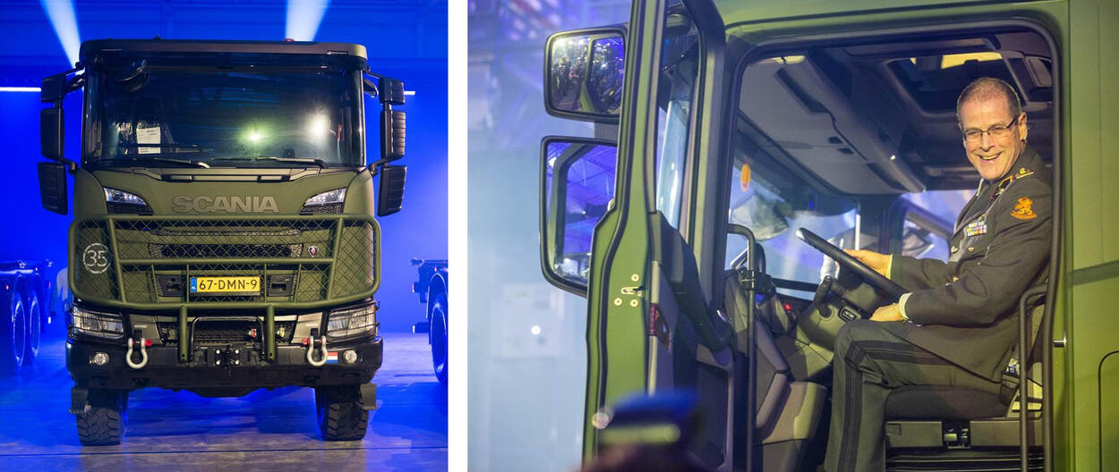 Defensie heeft onlangs bij de firma Scania in Zwolle de eerste van in totaal 2.000 vrachtwagens in ontvangst genomen. Het nieuwe materieel beschikt over talloze snufjes die helpen veiliger en energiezuiniger te rijden.