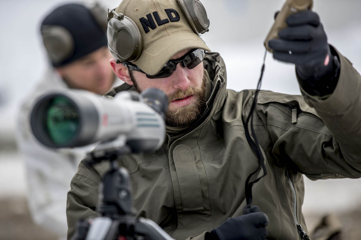 Sergeant-1 Maarten hanteert de Kestrel schietcomputer. Voer elementaire gegevens in als afstand en windsnelheid en de schietcorrectie rolt eruit.