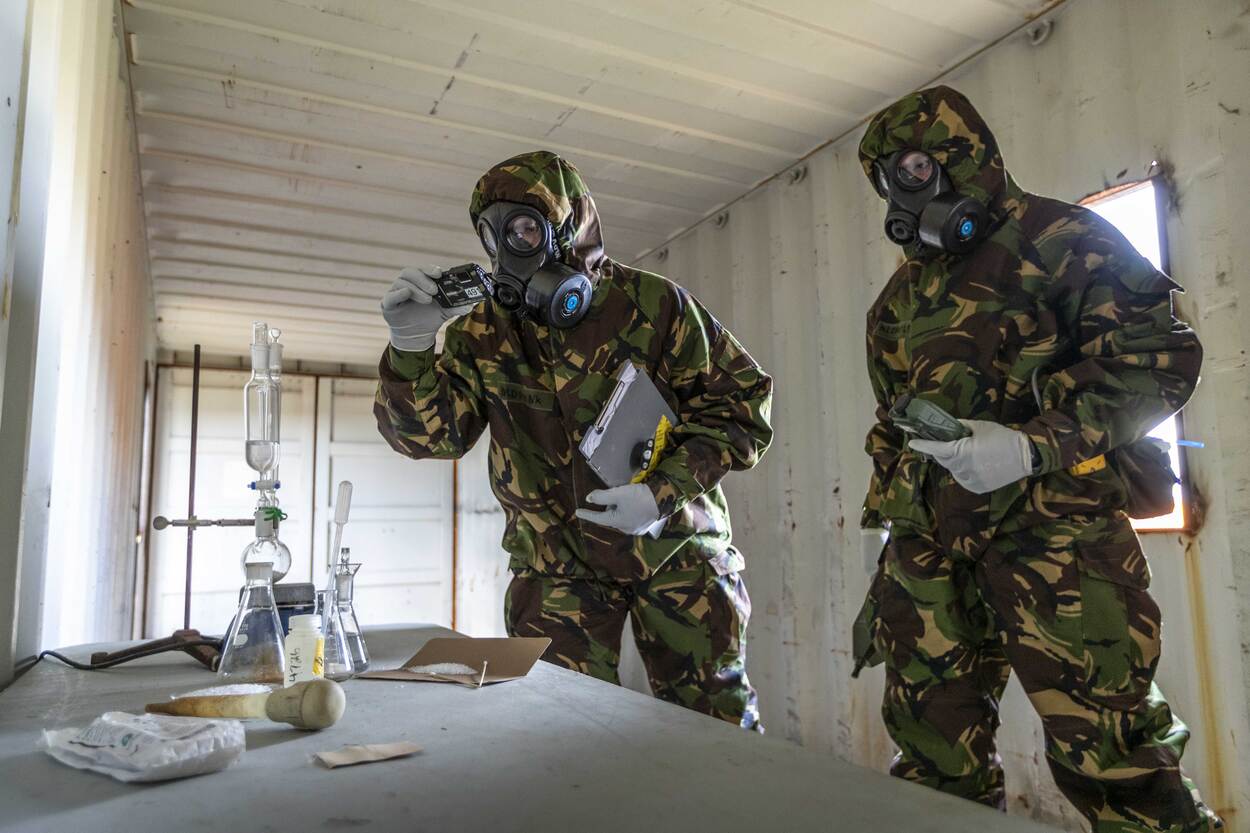 Qua DIM-capaciteit (detectie, identificatie en monitoring) lopen we achter. We zijn bijvoorbeeld niet in staat om ‘biologisch te meten’. We kunnen wel een biologisch besmet gebied betreden en samples nemen, maar we hebben geen laboratorium om de monsters te analyseren. Kijk je naar Duitsland, dan zie je dat ze overal ter wereld een lab kunnen opzetten. Essentieel, want een sample van een biologisch middel kun je niet even per vliegtuig naar TNO sturen voor analyse. Ook tussen de CBRN-pakken zitten verschillen. Zo bestaat het pak van de Duitsers uit 1 stuk met een rits: veel handiger in de ontsmettingsstraat. En het is ook een stuk dunner dan dat van ons.