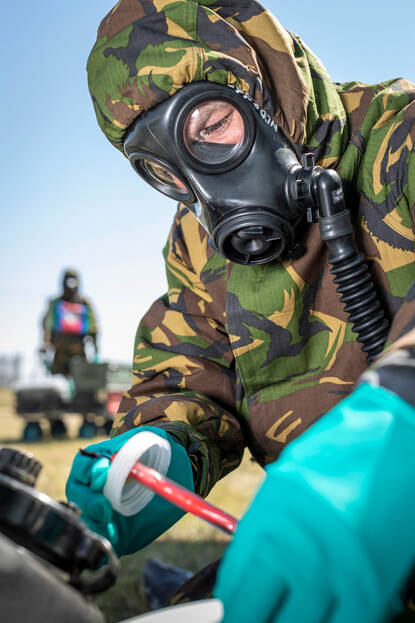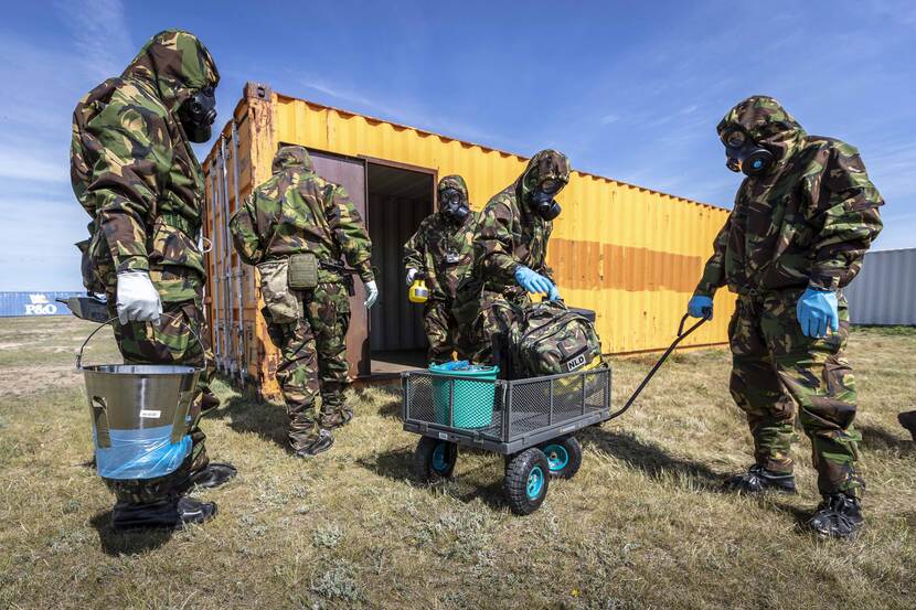 Dit is een jaarlijkse oefening met echte CBRN-strijdmiddelen, opgezet door de NAVO. In totaal trainen hier 13 landen. Dat is aan de ene kant voor de eenheden zelf, om vertrouwen te krijgen in het materiaal en elkaar. Trainen met echte stoffen doet iets met je. Vergelijk het met een schietoefening. Als je met scherp schiet, sta je ook anders op de schietbaan. Aan de andere kant is deze oefening er om bij andere NAVO-landen ‘in de CBRN-keuken’ te kijken.