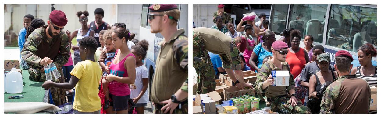 Militairen van de Compagnie in de West delen voedsel uit op Sint-Maarten na orkaan Irma in 2017. Archieffoto’s uit 2018.