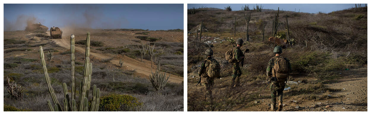 Op Curaçao wanen militairen zich tussen de rotsen en stekelplanten even in snikheet en kurkdroog Afghanistan. Een oefenwalhalla waar militairen zich goed kunnen inleven, weet majoor Marcel Krul, sinds 4 jaar in het Caribisch gebied als uitwisselingsofficier CLAS. “Door te oefenen onder verzwaarde omstandigheden werken ze aan hun eigen gereedstelling, zijn we zichtbaar aanwezig en gereed voor eventuele ‘echte’ inzet.”