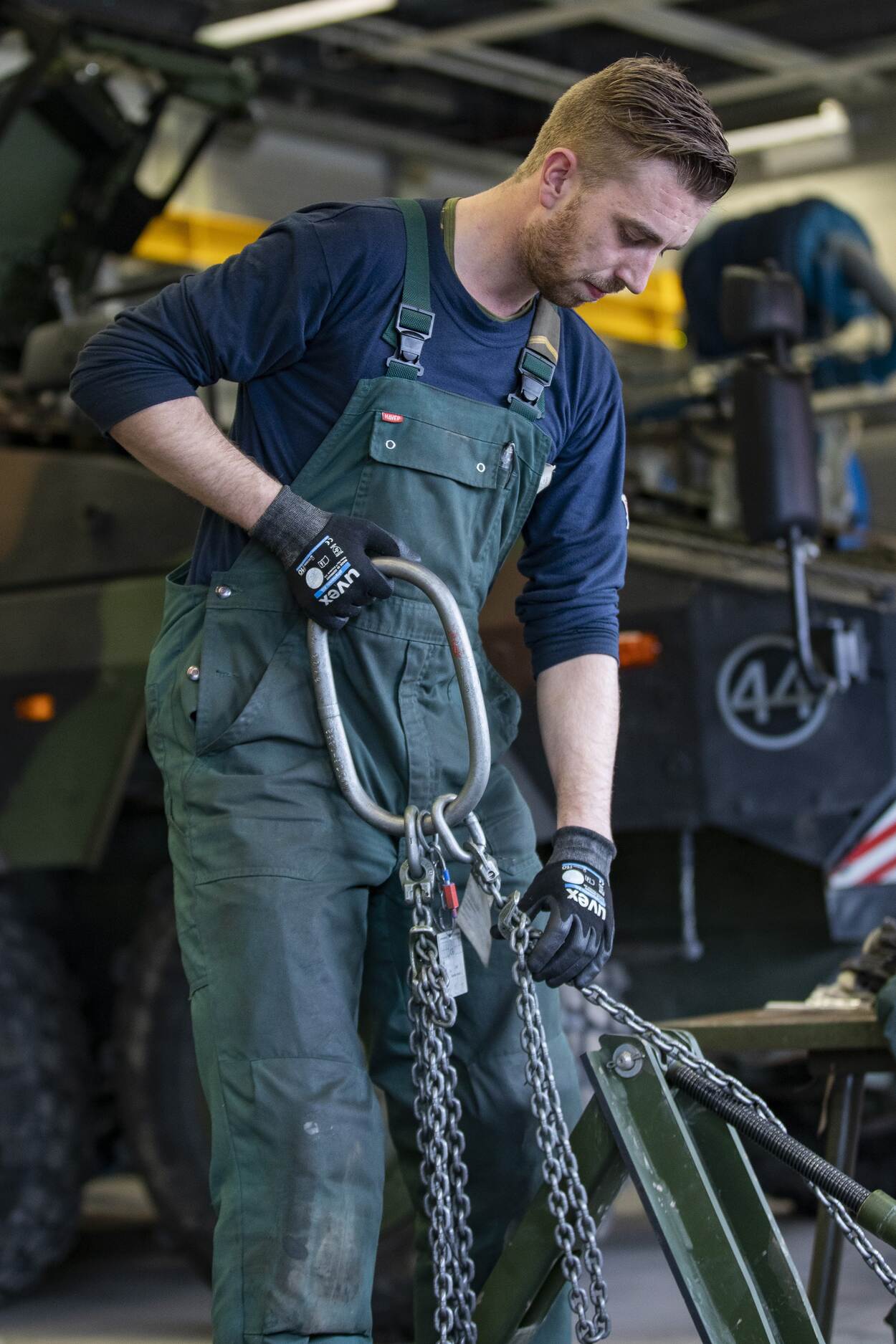 Sergeant Bart staat op het punt een onderdeel van de Boxer omhoog te laten hijsen.