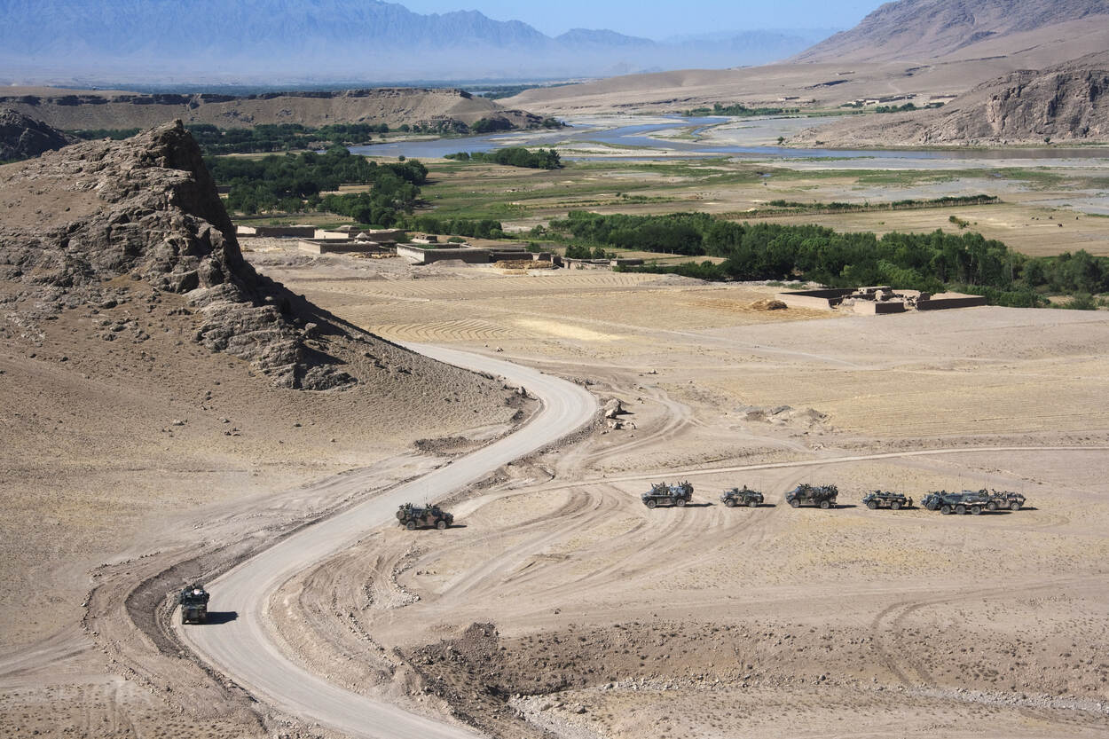 Nederlandse voertuigen trekken stofwolken op tijdens een operatie in Uruzgan.