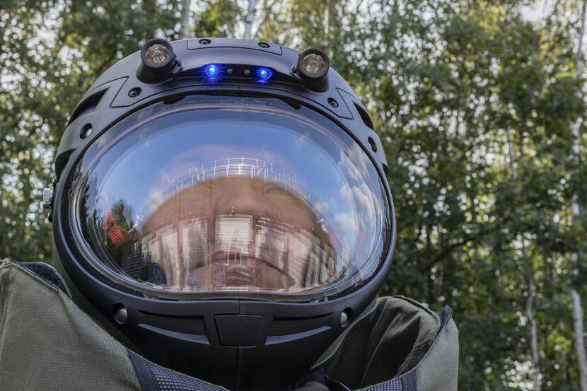 Het paradepaardje van bompak nr. 10 is voice control. “Alsof je van een Nokia 3310 naar een iPhone X gaat”, benadrukt EOD’er sergeant-majoor Maarten. ‘Licht aan’, ‘licht rood’, ‘ventilatie uit’: het zijn zomaar een paar commando’s die het pak laten werken. “Handmatige bediening is prima, behalve als je je handen vol hebt. En laten wij nu vooral met onze handen werken.”