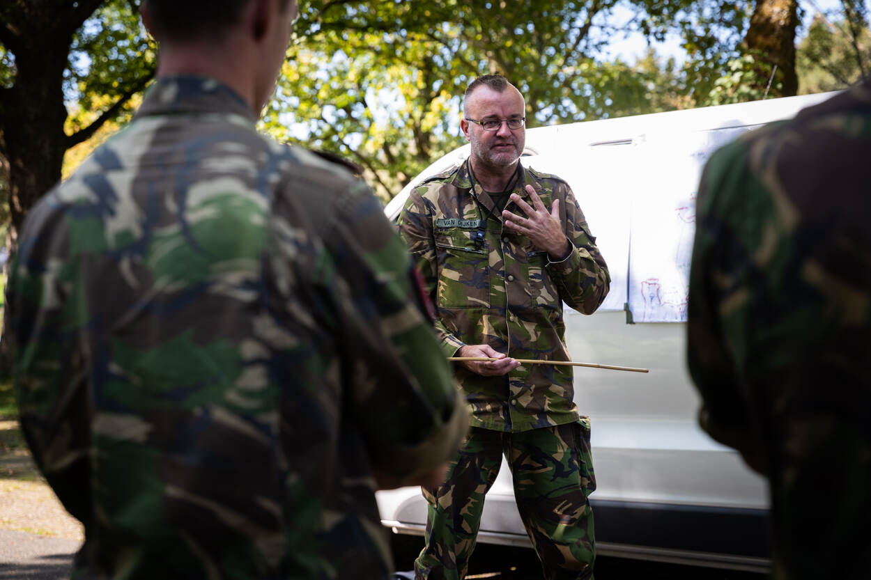 Sergeant-majoor Van Dijken vertelt tijdens een battlefield tour wat er in het Dreiherrenwald gebeurde.