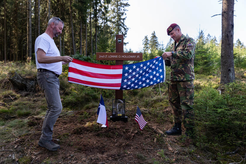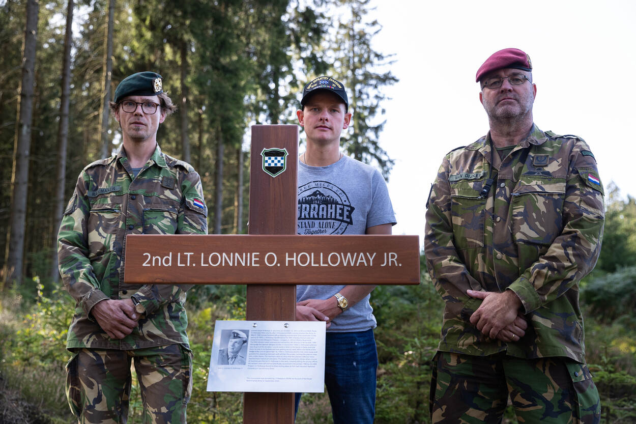 Een groepje militairen van 13 Infanteriebataljon Regiment Stoottroepen Prins Bernhard loopt door het Belgische Dreiherrenwald, pal op de grens met Duitsland. Ze torsen een houten kruis met betonnen voet met zich mee. Op de dwarsbalk staat ‘2nd lieutenant Lonnie O. Holloway jr.’. Het logo van de 99th Infantry Division en een kunststofplaat met een foto en een levensbeschrijving geven meer duidelijkheid. Op een voor een buitenstaander willekeurige plek graven de militairen het monument in.