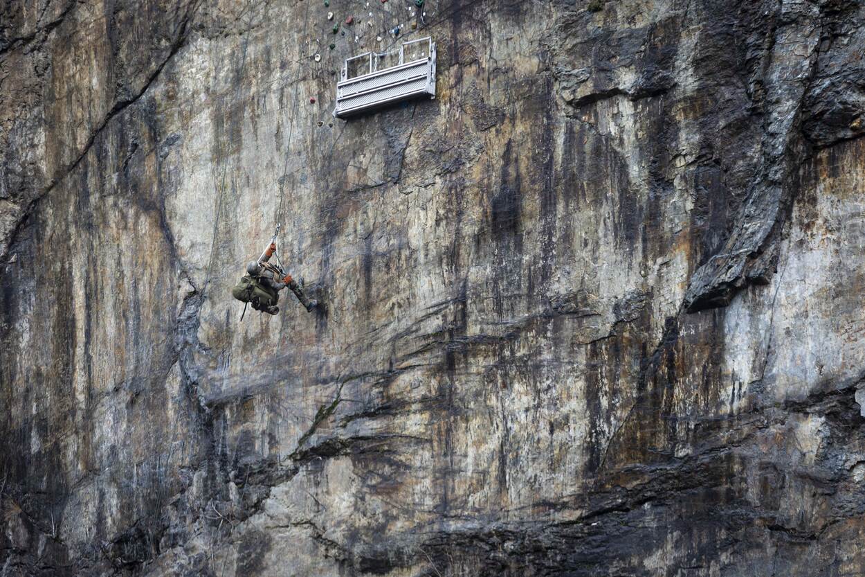 Een rode baret plakt tegen een bergwand aan in het Duitse Sauerland, als onderdeel van ‘Vormen Trainen Luchtmobiel’.