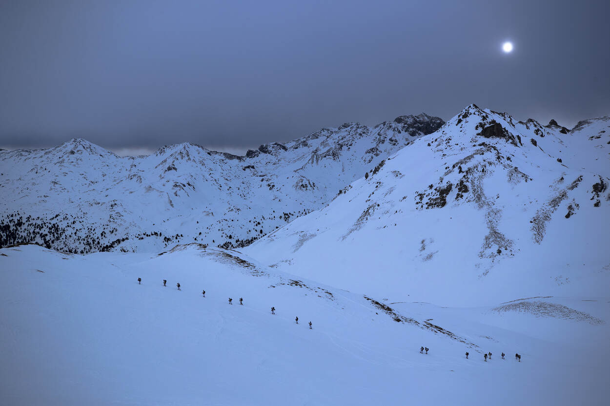 Infanteristen van de B-cie van 17 Pantserinfanteriebataljon leren tijdens oefening ‘Snow Eagle II’ in Tirol opereren in onoverzichtelijk terrein.