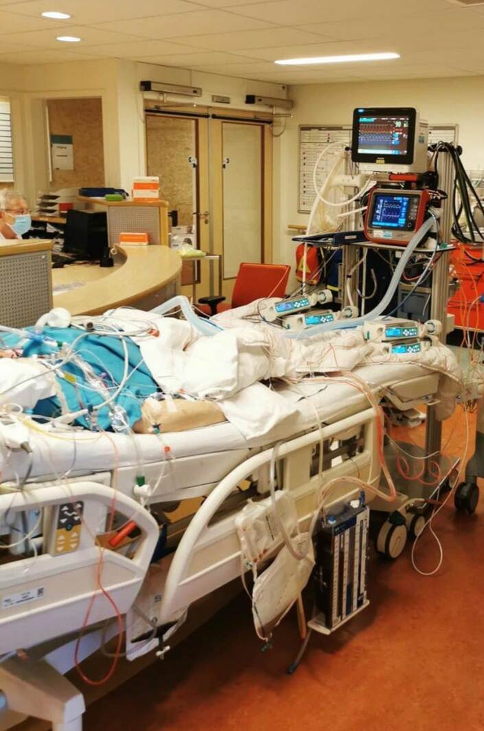“Het begon met overplaatsingen uit Brabant, maar binnen 2 weken werden onze volledige IC en SEH overspoeld met COVID-patiënten. We schaalden op, bouwden onze recovery om tot IC. Die eerste piek was absurd. Als je 1 patiënt onder je hoede hebt die slecht gaat, kan je daar een hele dag druk mee zijn. Nu probeerde je zo 2 of 3 patiënten stabiel te houden. Dat waren zeker niet allemaal oude mensen. De meeste coronagevallen waren mensen tussen de 50 en 70 jaar, vaak met overgewicht, maar ik heb ook twintigers voorbij zien komen. Zelf raakte ik aan het begin van deze eerste golf ook besmet. Ik was 2 dagen ziek en voelde me snel weer oké. Ik merkte toen wel aan alles: ik móét werken, ik kan níet thuiszitten.