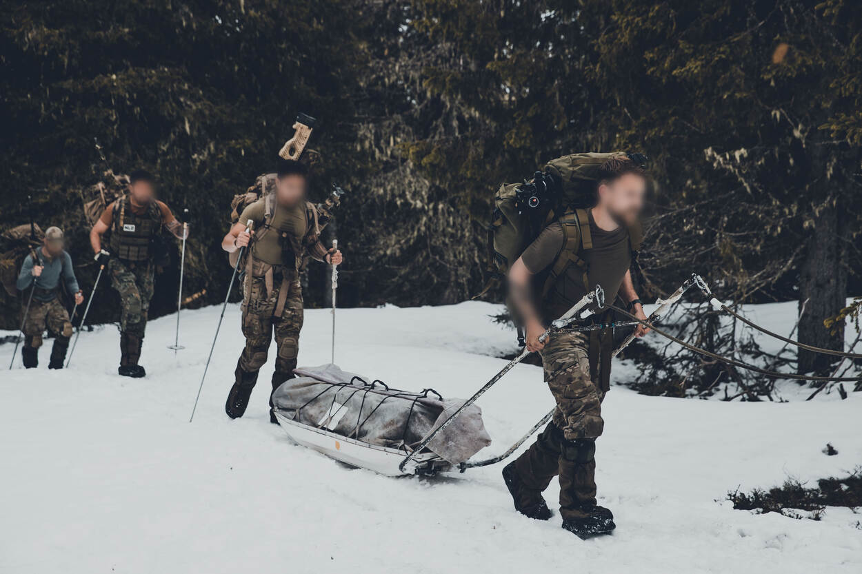 Met de slee worden alle wapens en toebehoren naar boven gesleurd door de sneeuw.