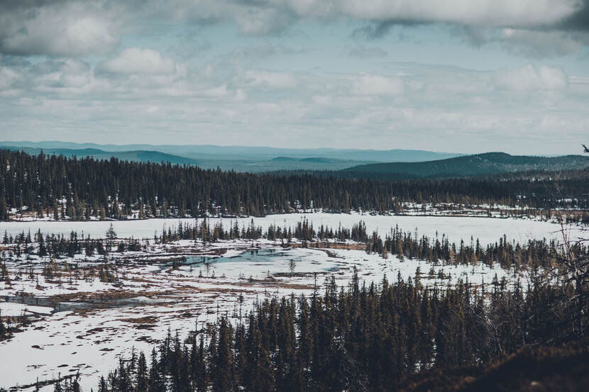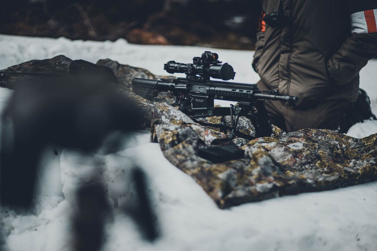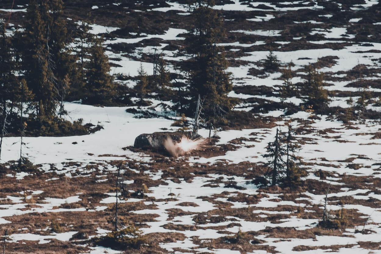 Een goede omgeving dus, maar dat betekent van tijd tot tijd ook stoempen. Voor een training met de nieuwe HK .417 (met demper), de Accuracy en de Barrett .50 moet eerst de Hästliden beklommen worden. Een tocht omhoog door smeltende sneeuw en drassige mosgrond, met volle bepakking.
