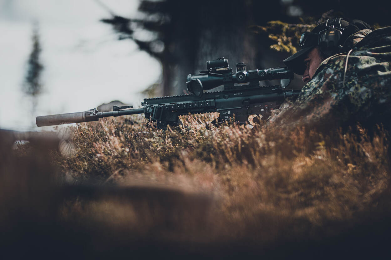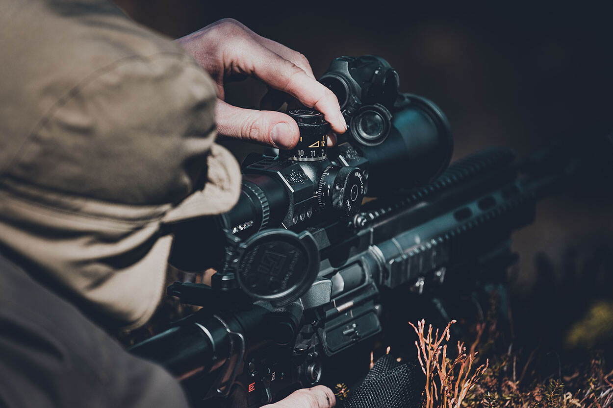 Op aanwijzingen van de spotter stelt de schutter de HK .417 in voor het perfecte schot.