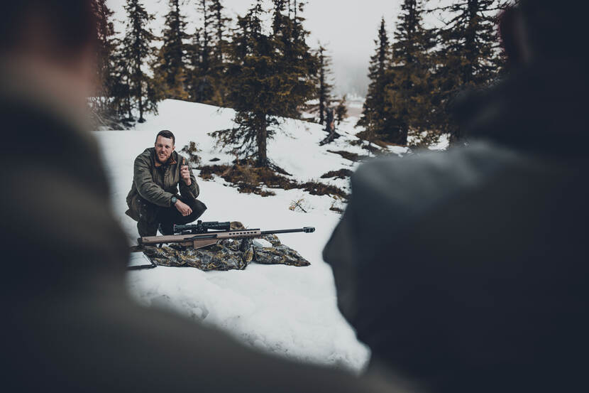 De kerels sleuren volle bak 3 sledes omhoog, met daarin de wapens en alle munitie. Een tocht met beloning: eenmaal bovenaan verschijnt de schietbaan, met wijds uitzicht en doelen in het dal achter het meer, op 400 tot 1.280 meter.