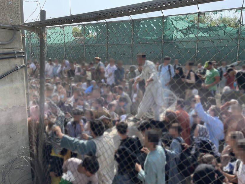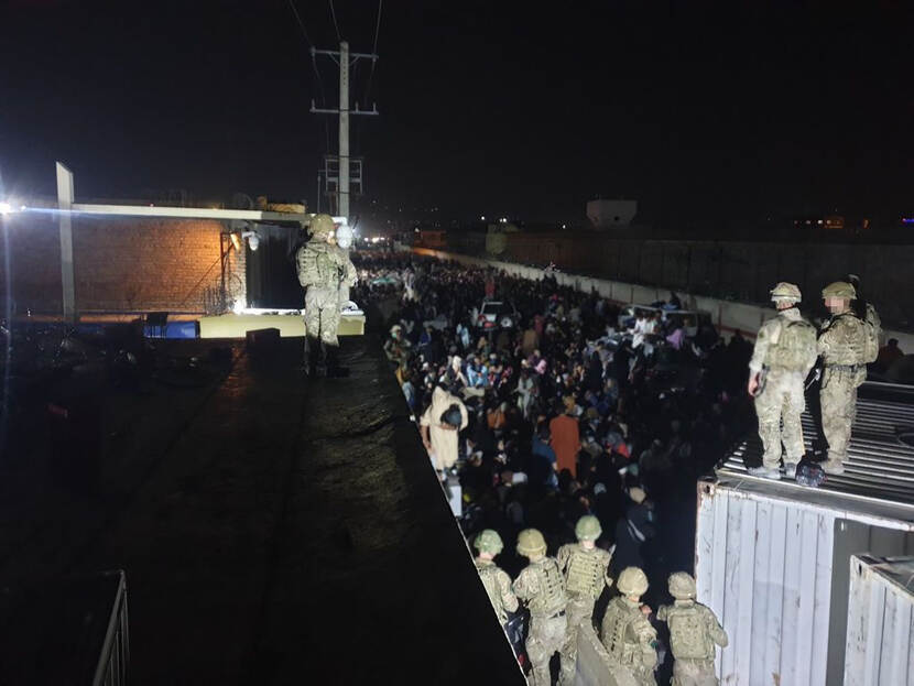 Op het vliegveld richten de Nederlanders een compound in, maken een beveiligingsplan en zetten de comms met Pakistan op, de logistieke hub vanwaar de operatie wordt geleid door het Nederlandse contingent aldaar. Die eerste nacht verkennen de commando’s het hele vliegveld. Spreken met coalitiepartners ter plaatse. Bij de North en East Gate staan operators bij de menigte. “Wat we zagen was inhumaan. Kinderen die werden doorgegeven. Mensen die werden verdrukt of in hun eigen poep en plas stonden. Zowel Amerikanen als Taliban vuurden schoten af om de meute te beheersen. Het was een en al hysterie en wanhoop.”